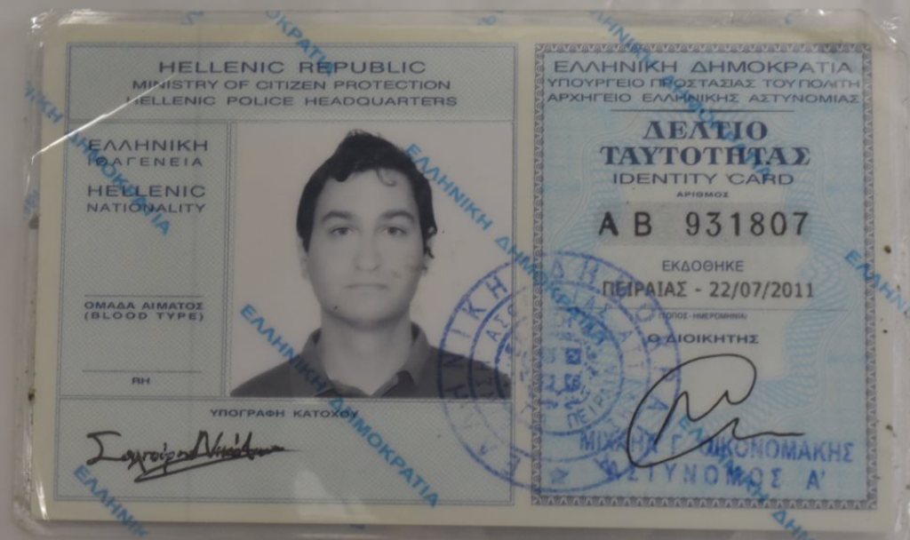 Η πλαστή ταυτότητα του λεγόμενου «Τοξοβόλου» έχει τον αριθμό ΑΒ 931807, φέρεται να εκδόθηκε την 22/07/2011 από το Τμήμα Ασφαλείας Πειραιά, υπό στοιχεία ΣΑΧΤΟΥΡΗΣ ΝΙΚΟΛΑΟΣ του ΙΩΑΝΝΗ και της ΜΑΡΙΑΣ γεν. 23/10/1987 στον Πειραιά Αττικής, δημότης Πειραιά.