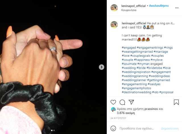Η Έλενα Πολυχρονοπούλου στις 24 Αυγούστου ανάρτησε φωτογραφίες στο Instagram με το μονόπετρο που της έκανε πρόταση γάμου ο Ρεγγινίδης.