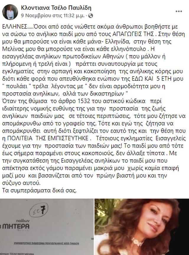 «ΕΛΛΗΝΕΣ….. Όσοι από εσάς νιώθετε ακόμα άνθρωποι βοηθήστε με να σώσω το ανήλικο παιδί μου από τους ΑΠΑΓΩΓΕΙΣ ΤΗΣ.