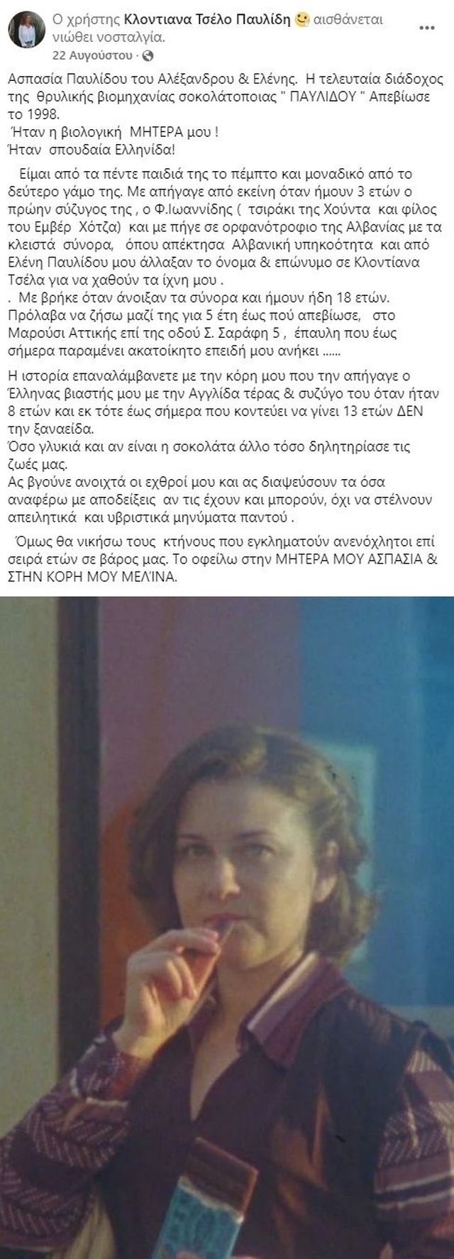 Η Κλοντιάνα Τσέλο, που πυροβόλησε τον γιατρό Γεώργιο Νέο το μεσημέρι της Πέμπτης έξω από το σπίτι του στο Χαλάνδρι, υποστηρίζει ότι είναι η τελευταία διάδοχος της θρυλικής βιομηχανίας σοκολατοποιΐας «Παυλίδη» είναι η βιολογική μητέρα της. Πώς βρέθηκε από την Ελλάδα μωρό στην Αλβανία; Λέει την ακόλουθη ιστορία.