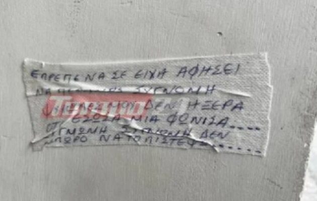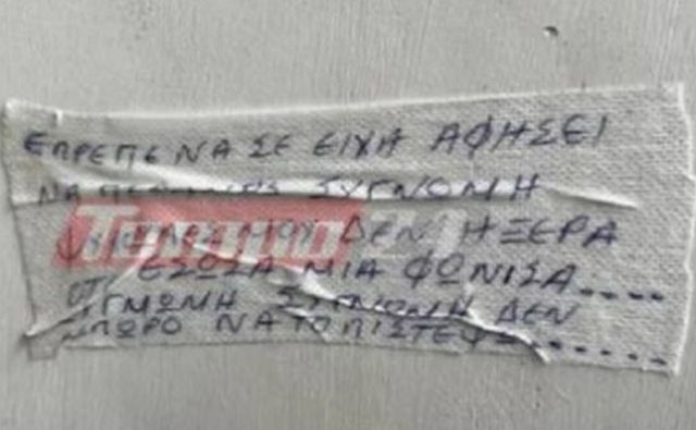 Ένα σημείωμα για τη Ρούλα Πισπιρίγκου τοποθετήθηκε έξω από την οικία της στην Πάτρα και σύμφωνα με όσα γράφει, ο συντάκτης (ή η συντάκτρια) ζητάει συγγνώμη από τα τρία νεκρά παιδιά, γιατί έσωσε «μία φόνισσα».