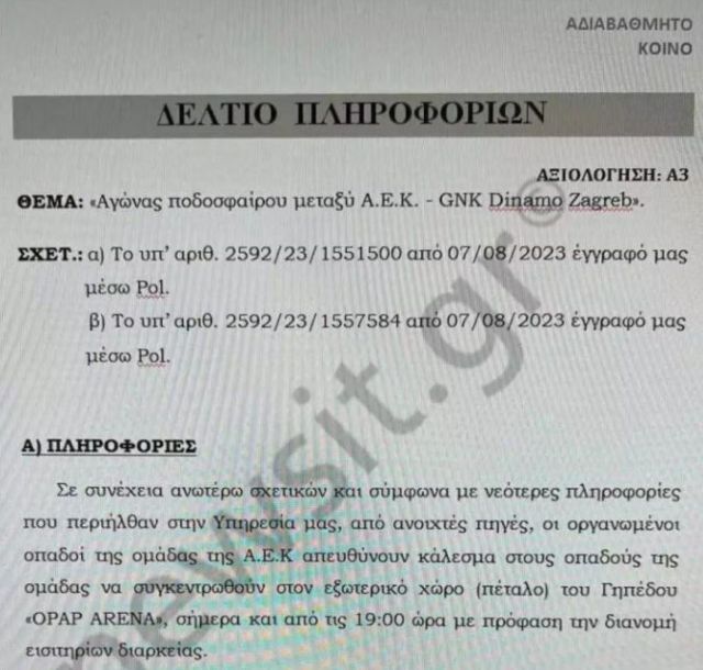 «Αξιολόγηση: Α3. Αγώνας ποδοσφαίρου μεταξύ ΑΕΚ – GΝΚ Dinamo Zagreb και επισυναπτόμενα έγγραφα από το σύστημα POL. με αριθμούς το υπ’ 2592 / 23 / 155 1500 από 7/8/ 2023 και 2592 / 23 / 155 7584 από 7/8/ 2023, σε συνέχεια ανωτέρω σχετικών και σύμφωνα με νεότερες πληροφορίες που περιήλθαν στην υπηρεσία μας από ανοιχτές πηγές, οι οργανωμένοι οπαδοί της ομάδας της ΑΕΚ, απευθύνουν κάλεσμα στους οπαδούς της ομάδας να συγκεντρωθούν στον εξωτερικό χώρο — πέταλο – του γηπέδου OPAP ARENA σήμερα και από τις 19.00 ώρα με πρόφαση την διανομή εισιτηρίων διαρκείας».