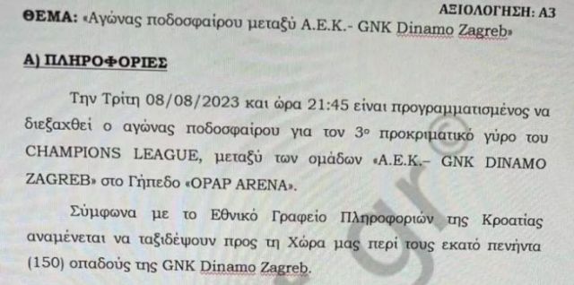 Στο πρώτο απόρρητο Ενημερωτικό Σημείωμα, οι αξιωματικοί του Τμήματος Καταπολέμησης Αθλητικής Βίας που φέρει με ημερομηνία 6/8/ 2023, τίτλο: «Αξιολόγηση: Α3 και θέμα: Αγώνας ποδοσφαιρου μεταξυ ΑΕΚ – GΝΚ Dinamo Zagreb» επισημαίνουν τα εξής αναφορικά με τις πληροφορίες που έλαβαν από τις ξένες αρχές: