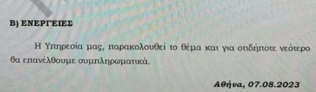 »Ενέργειες: υπηρεσία μας παρακολουθεί το θέμα και για οποιοδήποτε νεότερο θα επανέλθουμε συμπληρωματικά».