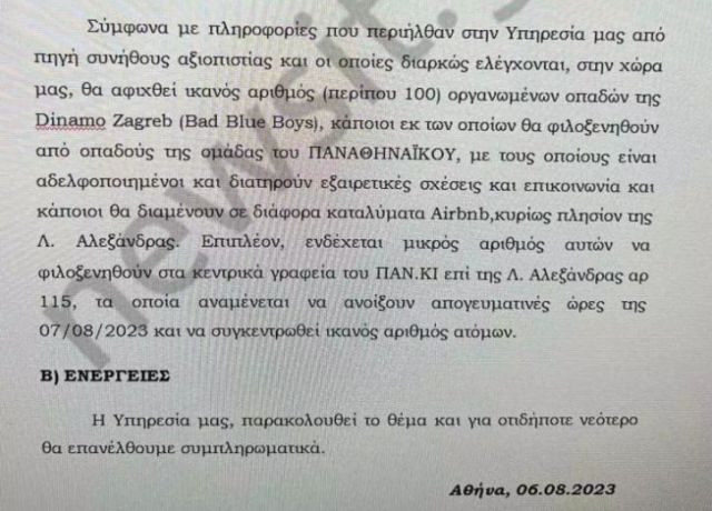»Σύμφωνα με πληροφορίες που περιήλθαν στην υπηρεσία μας από πηγή συνήθους αξιοπιστίας και οι οποίες διαρκώς ελέγχονται, στην χώρα μας θα αφιχθή ικανός αριθμός περίπου – 100 οργανωμένων οπαδών της GΝΚ Dinamo Zagreb – BAD BLUE BOYS– κάποιοι εκ των οποίων θα φιλοξενηθούν από οπαδούς της ομάδας του Παναθηναϊκού με τους οποίους είναι αδελφοποιημένοι και διατηρούν εξαιρετικές σχέσεις και επικοινωνία και κάποιοι θα διαμένουν σε διάφορα καταλύματα Airbnb κυρίως πλησίον της λεωφόρου Αλεξάνδρας.