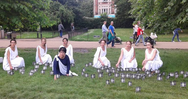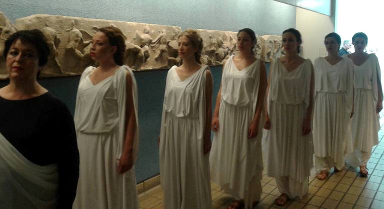 Η διεθνούς φήμης σοπράνο Σόνια Θεοδωρίδου συνοδευόμενη από έξι πανέμορφες Ελληνίδες ντυμένες στα λευκά, ως άλλες Καρυάτιδες, μπήκαν στο Βρετανικό μουσείο αναζητώντας την χαμένη «αδερφή τους», προκαλώντας το ενδιαφέρον τόσο των τουριστών αλλά και όσων επισκέπτονταν εκείνη την ώρα το μουσείο.