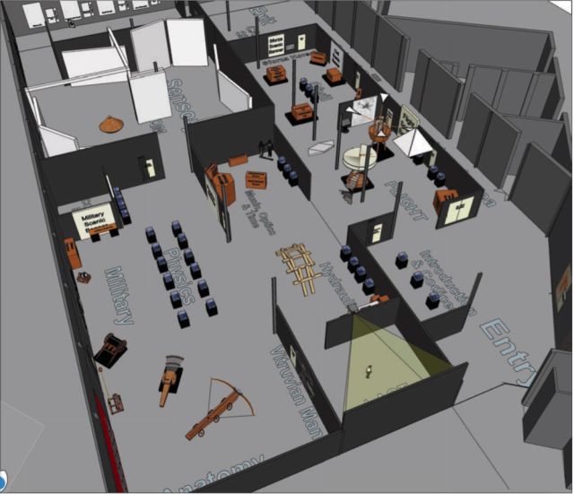 75 μοντέλα των εφευρέσεών του, αναπαραγωγές σε φυσικό μέγεθος, διαδραστικές μηχανές, αντίγραφα των περίφημων κωδίκων του και συνολικά πάνω από 200 εκθέματα σχεδιασμένα σε συνεργασία με το Μουσείο Leonardo da Vinci της Ρώμης.