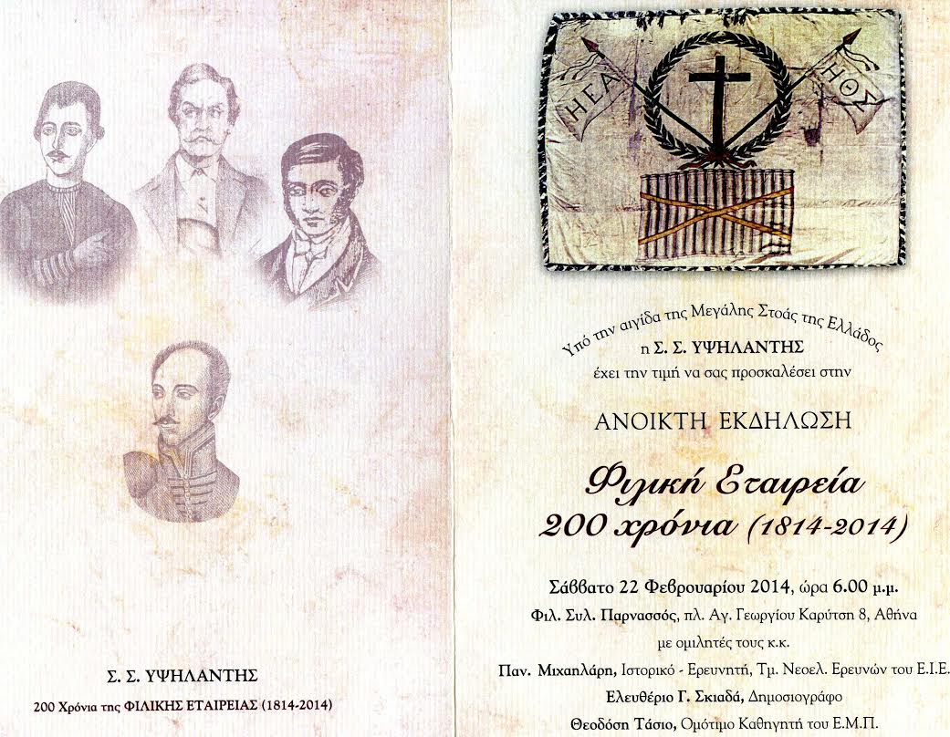 Μια μεγαλειώδης ανοιχτή εκδήλωση για τα 200 χρόνια από την ίδρυση της Φιλικής Εταιρείας θα λάβει χώρα το Σάββατο 22 Φεβρουαρίου στις 18.00, στο Φιλολογικό Σύλλογο “Παρνασσός”, Πλατεία Αγ. Γεωργίου Καρίτση 8, στο κέντρο της Αθήνας.