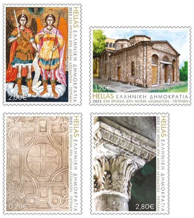 Η Σειρά Γραμματοσήμων «350-Χρόνια Ιερά Μονή Ασωμάτων-Πετράκη» περιλαμβάνει τέσσερα γραμματόσημα που απεικονίζουν κειμήλια και αρχιτεκτονικές λεπτομέρειες της Μονής.