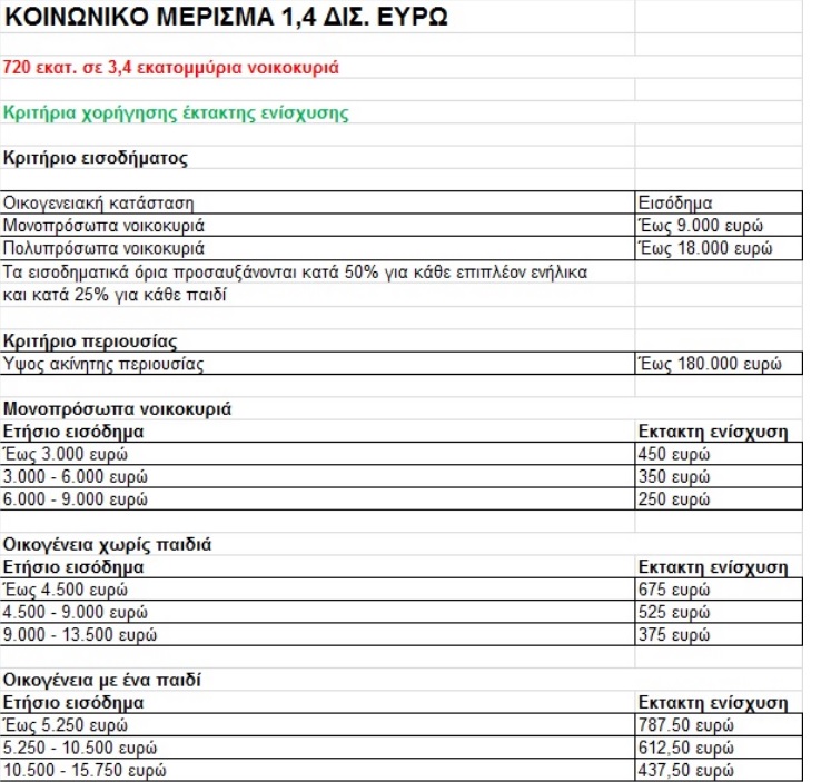 Από το 1,4 δισ. ευρώ, ποσό 720 εκατ. ευρώ θα καταβληθεί υπό μορφή έκτακτης οικονομικής ενίσχυσης σε 3,4 πολίτες.