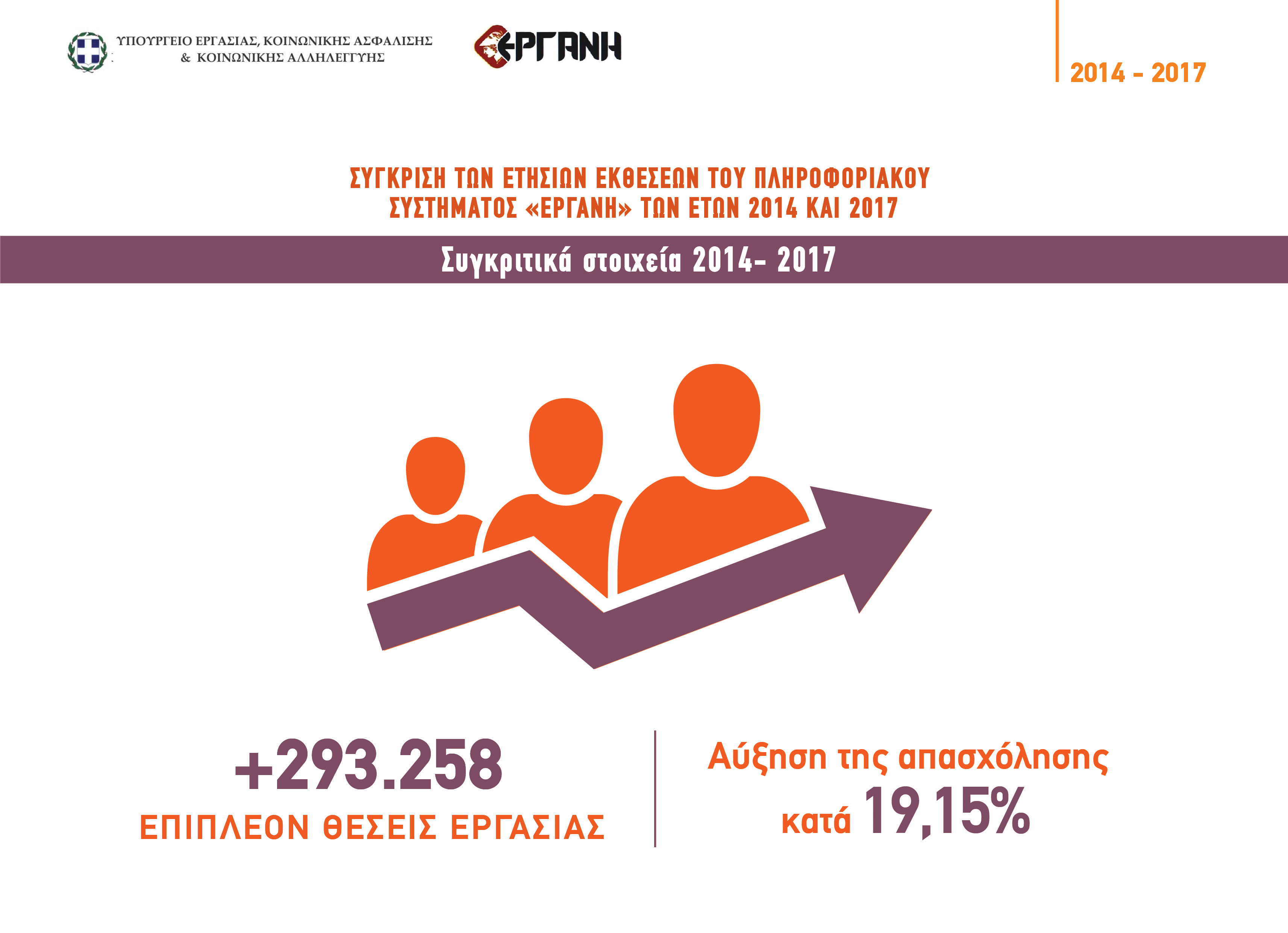 Συγκρίνοντας τα στοιχεία των ετών 2014 και 2017, προκύπτει αύξηση της απασχόλησης κατά 293.258 θέσεις εργασίας ή ποσοστό 19,15%.