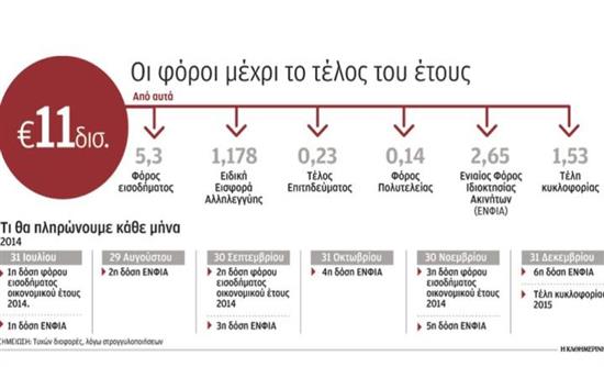 Μέχρι έξι φόρους, συνολικού ύψους 11 δισ. ευρώ καλούνται να πληρώσουν οι 5,5 εκατομμύρια φορολογούμενοι από τον Ιούλιο του 2014.
