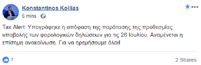 Υπογράφηκε η απόφαση της παράτασης της προθεσμίας υποβολής των φορολογικών δηλώσεων για τις 26 Ιουλίου. Αναμένεται η επίσημη ανακοίνωση. Για να ηρεμήσουμε όλοι!