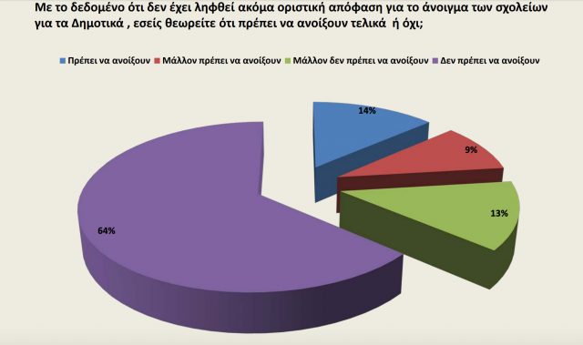 «Όχι» απαντά το 64% και «μάλλον όχι» το 13%, ενώ υπέρ του να επιστρέψουν στα θρανία οι μαθητές του δημοτικού είναι το 23% (14% απάντησε πως πρέπει να γυρίσουν και 9% πως μάλλον πρέπει).