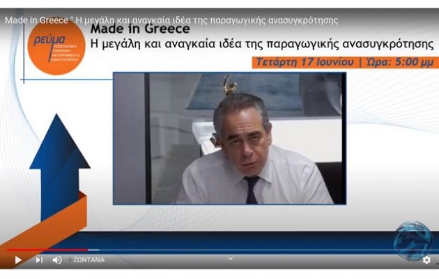 Στη σημασία του Made in Greece για την οικονομία και τις επιχειρήσεις (εμπορικό ισοζύγιο, ανεργία, ανάπτυξη) αναφέρθηκε ο πρόεδρος της Κεντρικής Ένωσης Επιμελητηρίων (ΚΕΕ) και του Εμπορικού και Βιομηχανικού Επιμελητηρίου Αθηνών (ΕΒΕΑ) Κωνσταντίνος Μίχαλος στη διαδικτυακή συζήτηση που οργανώνει το Ρ.ΕΥ.Μ.Α. με θέμα: «Made in Greece. Η μεγάλη και αναγκαία ιδέα της παραγωγικής ανασυγκρότησης».