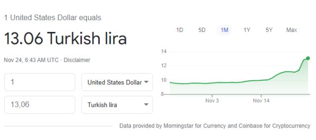 Η Τετάρτη ξεκίνησε συνεχίζοντας την καταστροφική καθίζηση της τουρκικής λίρας. Στις 08.45 το πρωί η ισοτιμία είχε φτάσει 13,06 λίρες με ένα δολάριο.