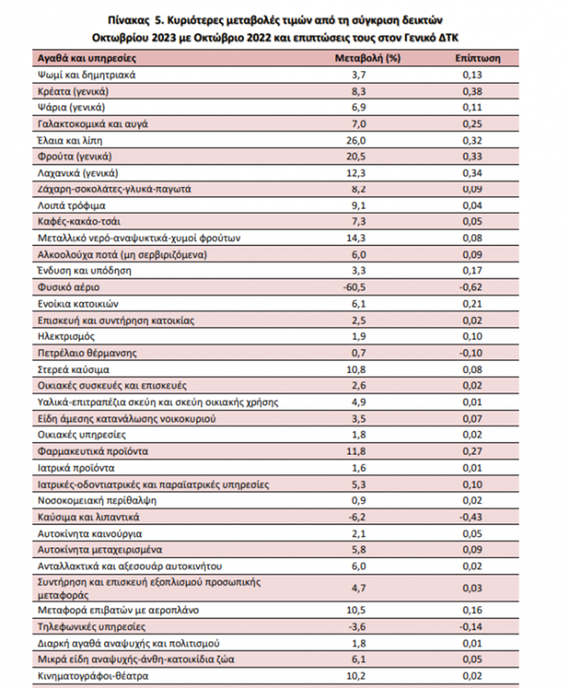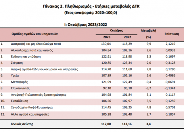 Η αύξηση του Γενικού ΔΤΚ κατά 3,4% τον μήνα Οκτώβριο 2023, σε σύγκριση με τον αντίστοιχο Δείκτη του Οκτωβρίου 2022, προήλθε κυρίως από τις μεταβολές στις ακόλουθες ομάδες αγαθών και υπηρεσιών: