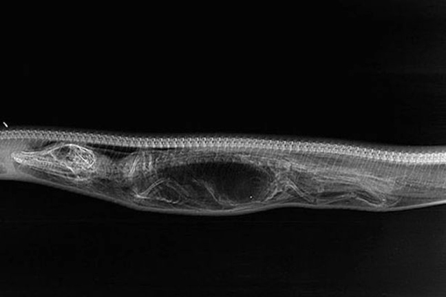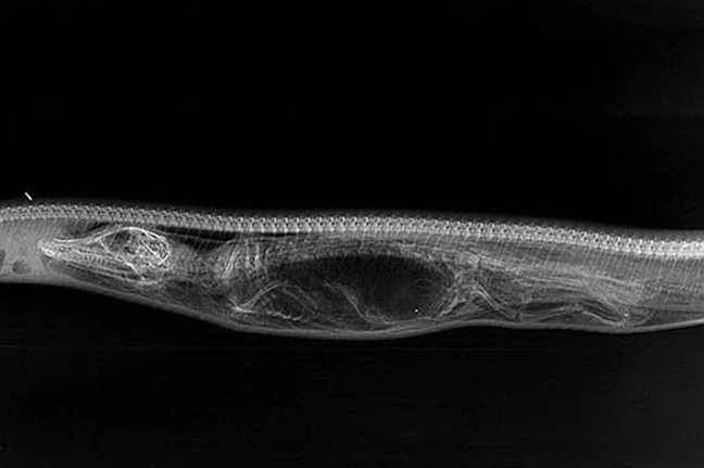 Ο αλιγάτορας σταδιακά χωνεύεται, το σώμα του συνθλίβεται και διαλύεται μέσα στην κοιλιά του φιδιού. Τη διαδικασία της χώνεψης καταγράφουν με εντυπωσιακό τρόπο οι ακτινογραφίες.