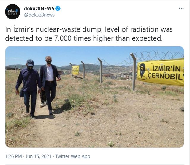 Η ιστοσελίδα dokuz8NEWS @dokuz8news κατήγγειλε με ανάρτησή της στο Twitter, ότι τα επίπεδα ακτινοβολίας στη χωματερή εντοπίστηκαν να είναι 7.000 φορές υψηλότερα από το αναμενόμενο.