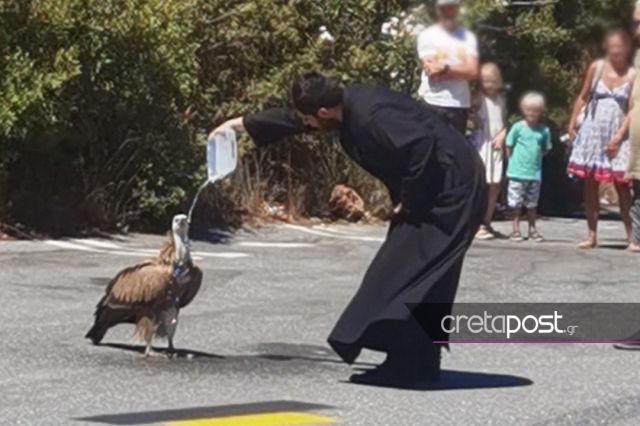 Ένα ακόμη εξαντλημένο από τη ζέστη όρνιο δέχτηκε τη φροντίδα ενός ιερέα στη μέση της εθνικής οδού Ηρακλείου Αγίου Νικολάου.
