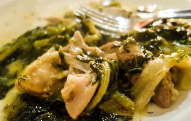 Εν τω μεταξύ, διαλύουμε το νισεστέ στο χυμό λεμονιού και χτυπάμε τα αυγά. Προσθέτουμε το μείγμα λεμονιού και ακολούθως κουταλιές από το ζωμό του φαγητού μέχρι να ζεστάνει το μείγμα.