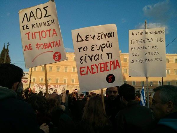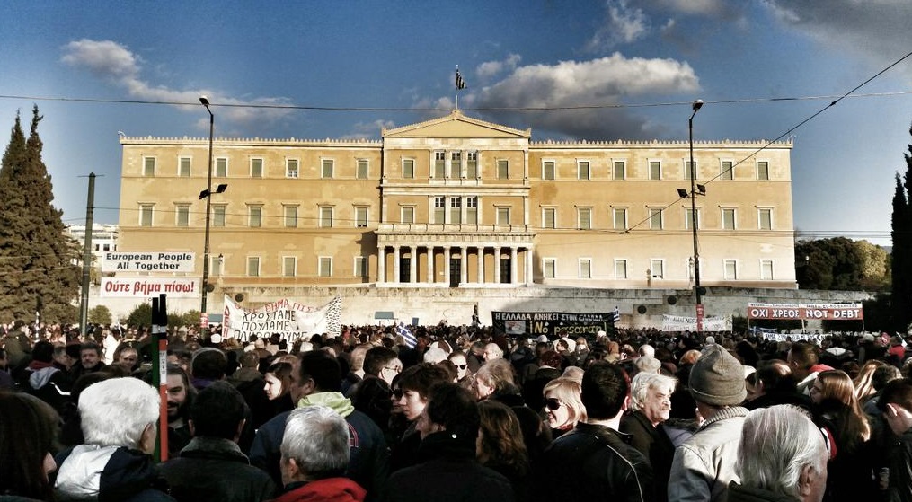 Χιλιάδες πολίτες από όλες τις συνοικίες της Αθήνας συρρέουν στην Πλατεία Συντάγματος, στο συλλαλητήριο κατά της λιτότητας που είχε προγραμματιστεί για τις 17.00 το απόγευμα της Κυριακής.