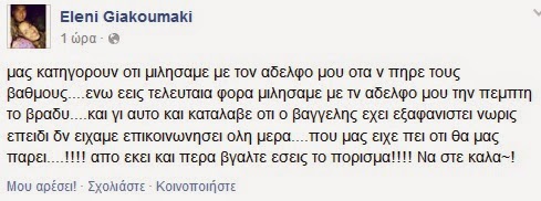 “Μας κατηγορούν ότι μιλήσαμε με τον αδελφό μου όταν πήρε τους βαθμούς, ενώ εμείς τελευταία φορά μιλήσαμε με τον αδελφό μου την Πέμπτη το βράδυ και γι’ αυτό και καταλάβαμε ότι ο Βαγγέλης έχει εξαφανιστεί νωρίς επειδή δεν είχαμε επικοινωνήσει όλη μέρα μαζί τους, αν και μας είχε πει ότι θα μας πάρει!!!!».