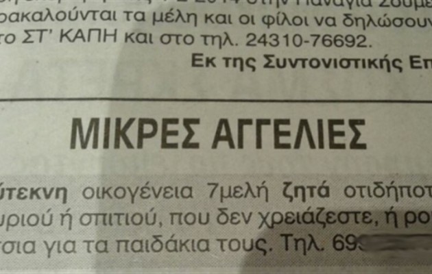 Στα Τρίκαλα ξανά, μια άλλη οικογένεια, πολύτεκνη αυτή τη φορά, ζητά μέσω… δωρεάν αγγελίας που δημοσιεύτηκε σε τοπική εφημερίδα τη βοήθεια των συνανθρώπων για «ο,τιδήποτε, είδη νοικοκυριού ή σπιτιού, που δε χρειάζεστε, ή ρούχα και παπούτσια για τα παιδάκια»!