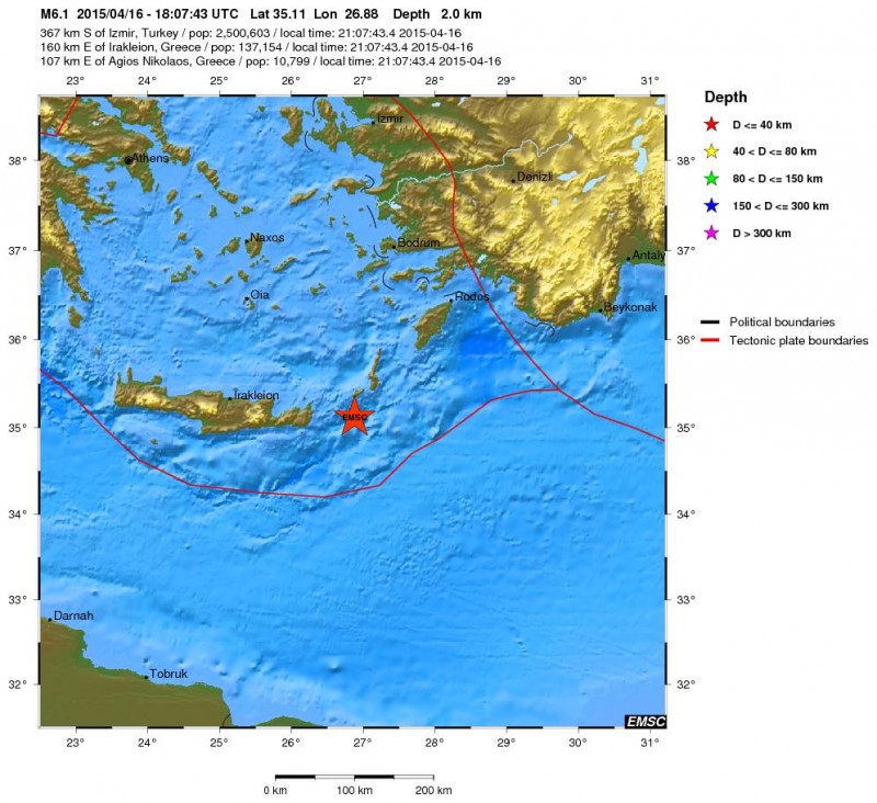 Ισχυρός σεισμός μεγέθους 6,1 της κλίμακας Ρίχτερ σημειώθηκε στην Κρήτη στις 21:07 το βράδυ της Πέμπτης.