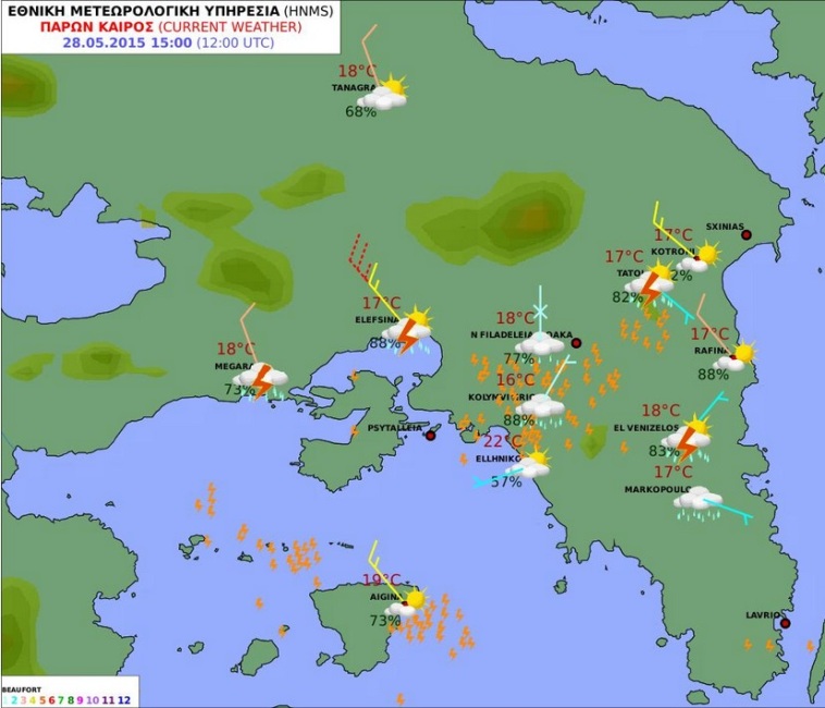 Την ώρα που τραβήχτηκαν οι παραπάνω φωτογραφίες, η κακοκαιρία που χτύπαγε την πρωτεύουσα είχε εκδηλωθεί όπως φαίνεται στον ακόλουθο χάρτη της Εθνικής Μετεωρολογικής Υπηρεσίας: