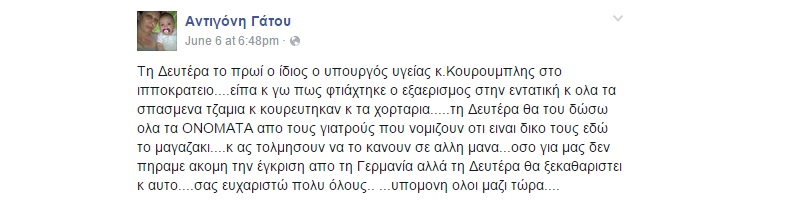 Η Αντιγόνη Γάτου ευχαριστεί τον κ. Κουρουμπλή που έδωσε εντολή να μεταφερθεί η μικρή της κόρη σε νοσοκομείο του εξωτερικού και συγκεκριμένα στο Helios Clinic της Γερμανίας, προκειμένου να αντιμετωπιστεί ενδονοσοκομειακή λοίμωξη, η οποία προκλήθηκε έπειτα από επέμβαση για τις κρανιοεγκεφαλικές κακώσεις που υπέστη σε τροχαίο.