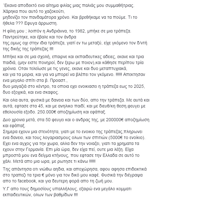 Και ολα αυτα, φυσικά με δανεια και των δύο, απο την τράπεζα. Με αυτά και αυτά, εφτασε στα 45, και με ανηλικο παιδί, και με διευθ/κη θεση, φευγει με εθελουσία εξοδο. 250.000€ αποζημίωση και εφάπαξ.