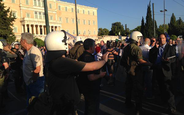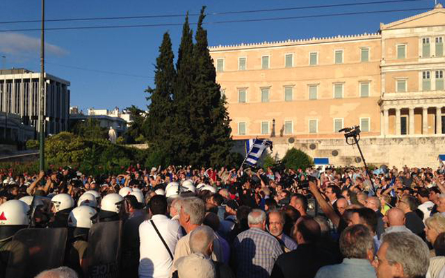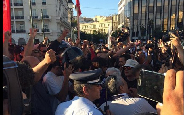 Εικόνα διχασμού στην πλατεία Συντάγματος με αντιεξουσιαστές να επιχειρούν να αμαυρώσουν την προγραμματισμένη γι’ αυτή την ώρα την συγκέντρωση όσων διαδηλώνουν υπέρ της παραμονής της χώρας στην Ε.Ε. και το ευρώ.