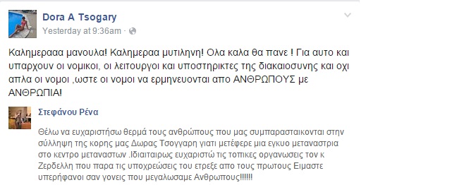 Ανάλογη και η ανάρτηση της μητέρας της κ. Τσογκάρη στη δική της σελίδα στο Facebook: «Θέλω να ευχαριστήσω θερμά τους ανθρώπους που μας συμπαραστέκονται στην σύλληψη της κόρης μας Δώρας Τσογκάρη γιατί μετέφερε μια έγκυο μετανάστρια στο κέντρο μεταναστών. Ιδιαιτέρως ευχαριστώ τις τοπικές οργανώσεις και το βουλευτή του ΣΥΡΙΖΑ Γιάννη Ζερδελή που παρά τις υποχρεώσεις του έτρεξε από τους πρώτους. Είμαστε υπερήφανοι σαν γονείς που μεγαλώσαμε Ανθρώπους!» γράφει.