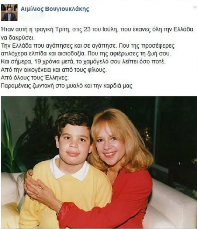 Με ένα τρυφερό μήνυμα μέσω του προφίλ του στο Facebook , ο ανιψιός της Αιμίλιος Βουγιουκλάκης, θέλησε να εκφράσει τα συναισθήματά του για την απώλεια της θείας του.