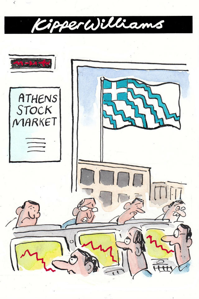 Με ένα… κάθε άλλο παρά ευρηματικό σκίτσο θέλησε ο κατά τ’ άλλα βασικός σκιτσογράφος του Guardian, ο Kipper Williams, να εξηγήσει τι ακριβώς συνέβη στο Χρηματιστήριο Αθηνών τη Δευτέρα μετά από 5 εβδομάδες λουκέτο.