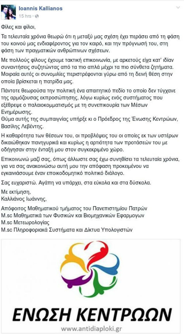 Με μια ανακοίνωσή του στον προσωπικό του λογαριασμό στο facebook, γνωστοποίησε την ένταξή του στην Ένωση Κεντρώων του Βασίλη Λεβέντη. «Η καθαρότητα των θέσεων του, οι προβλέψεις του οι οποίες εκ των υστέρων δικαιώθηκαν πανηγυρικά και κυρίως η αρτιότητα των προτάσεών του με οδήγησαν στην ένταξή μου στον συγκεκριμένο χώρο», αναφέρει ο κ. Καλλιάνος