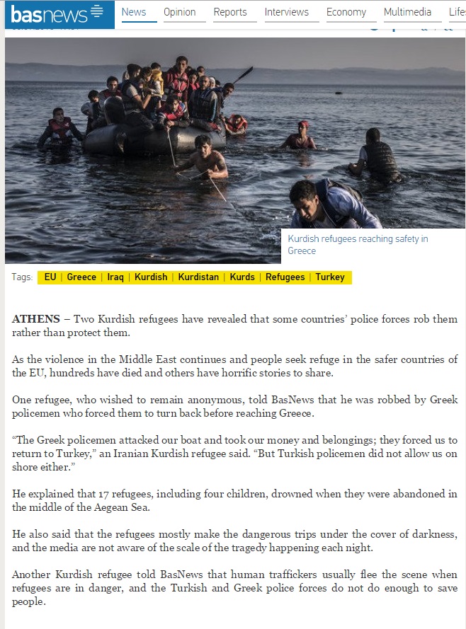 Ένας πρόσφυγας, ο οποίος ζήτησε να μη δημοσιευτεί το όνομά του, κατήγγειλε στο κουρδικό BasNews ότι τον λήστεψαν Έλληνες αστυνομικοί.