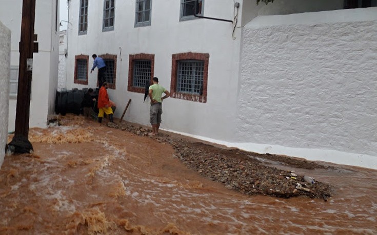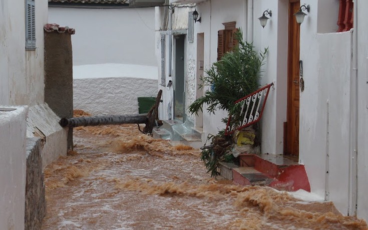 Το πρωί, λίγη ώρα μετά το ξέσπασμα της φθινοπωρινής καταιγίδας, το νησί είχε μετατραπεί σε… Βενετία, με τους χειμάρρους που είχαν σχηματιστεί στα σοκάκια του να παρασέρνουν τα πάντα στο πέρασμά τους.