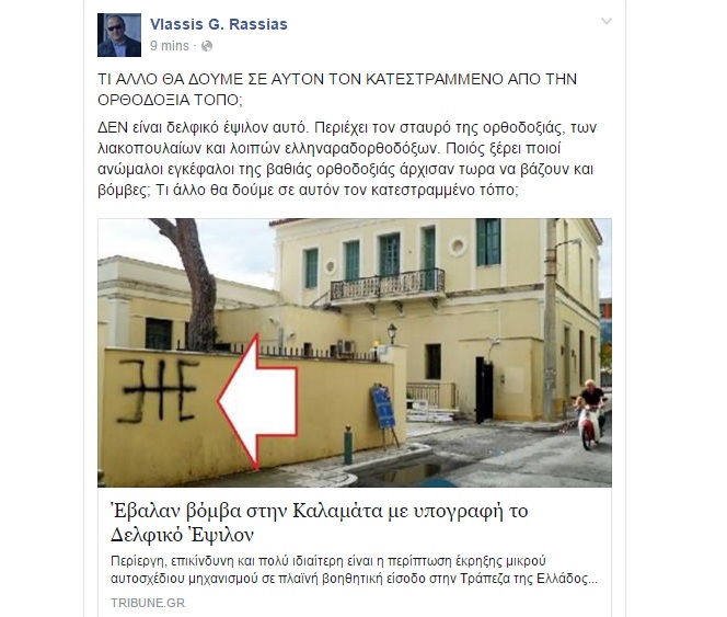 Ο γενικός γραμματέας του Υπάτου Συμβουλίου Ελλήνων Εθνικών, Βλάσης Ρασσιάς, σχολιάζοντας στο Facebook την είδηση ότι οι άγνωστοι, που τοποθέτησαν μικρό αυτοσχέδιο εκρηκτικό μηχανισμό σε πλαϊνή βοηθητική είσοδο στην Τράπεζα της Ελλάδος στην Καλαμάτα, ζωγράφισαν με μαύρο σπρέι το Δελφικό Έψιλον, έγραψε:
