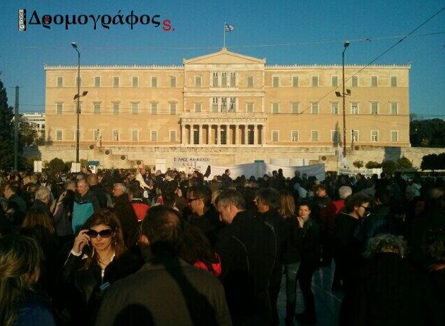 Χιλιάδες πολίτες διαδηλώνουν έξω από τη Βουλή, στην πλατεία Συντάγματος, ενώ ο ΣΥΡΙΖΑ αποχώρησε από τη συνεδρίαση της Βουλής.
