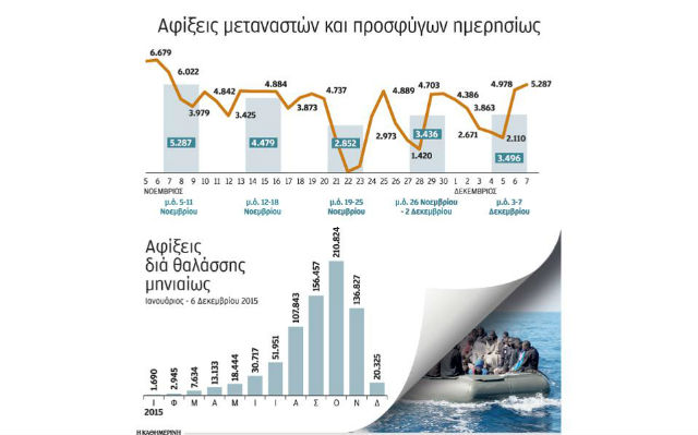 Σύμφωνα με στοιχεία που παρουσιάζει η εφημερίδα «Καθημερινή», αξίζει μόνο να αναφερθεί ότι τις πρώτες έξι ημέρες του Δεκεμβρίου, 20.325 αλλοδαποί είχαν περάσει στα ελληνικά νησιά, περισσότεροι από τους 18.444 που είχαν περάσει ολόκληρο τον φετινό Μάιο!