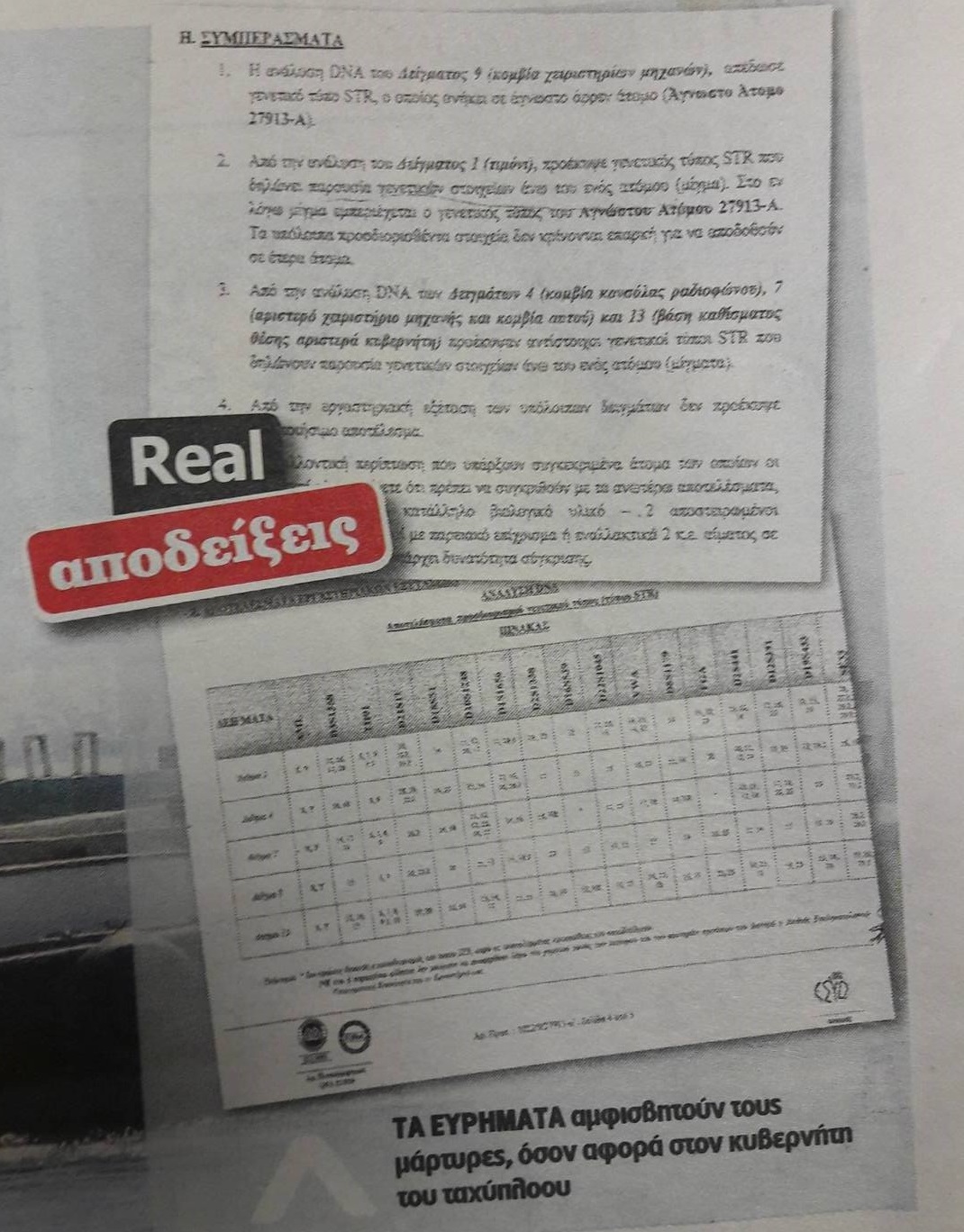 Οι επιστήμονες του τμήματος ανάλυσης βιολογικών υλικών είναι ξεκάθαροι: Η ανάλυση DNA του δείγματος 9 (κουμπιά χειριστηρίων μηχανών) απέδωσε γενετικό τύπο STR, ο οποίος ανήκει σε άγνωστο άρρεν άτομο (άγνωστο άτομο 27913-Α). Από την ανάλυση του δείγματος 1 (τιμόνι) προέκυψε γενετικός τύπος STR, που δηλώνει παρουσία γενετικών στοιχείων άνω του ενός ατόμου (μείγμα).