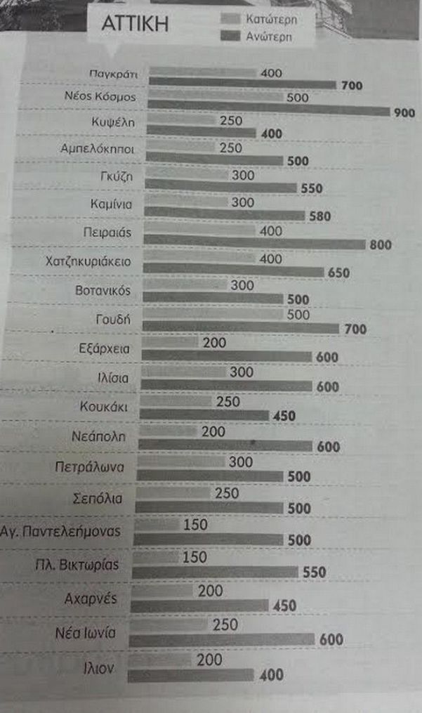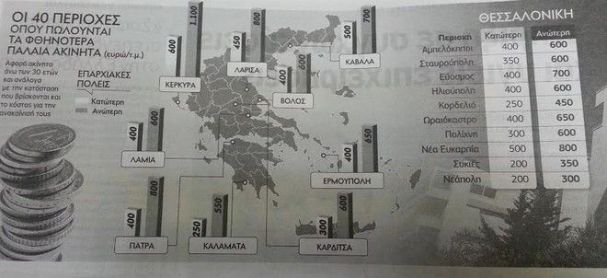 Σε ορισμένες περιπτώσεις, καινούριες κατοικίες σε Αθήνα και Θεσσαλονίκη έφτασαν να πωλούνται στο κόστος κατασκευής, ακόμη και κάτω από 1.000 ευρώ το τετραγωνικό μέτρο, ενώ παλιά διαμερίσματα σε Αθήνα και επαρχία, πωλούνται μέχρι και 100 ευρώ το τετραγωνικό.