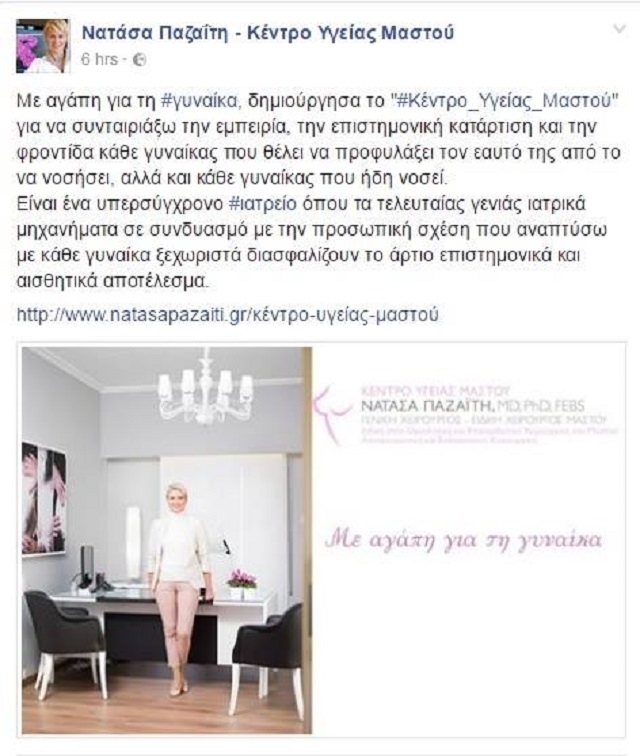 Διαβάστε την ανάρτηση της κας Νατάσας Παζαΐτη-Καραμανλή στο facebook για το Κέντρο Υγείας Μαστού: