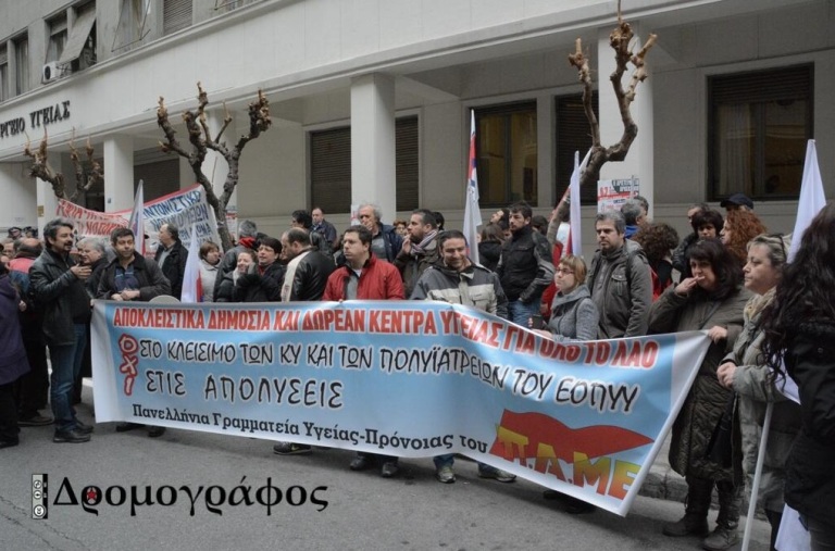 Σε εξέλιξη η συγκέντρωση των εργαζομένων στο χώρο της Δημόσιας Υγείας έξω από το κτίριο του Υπουργείου Υγείας.