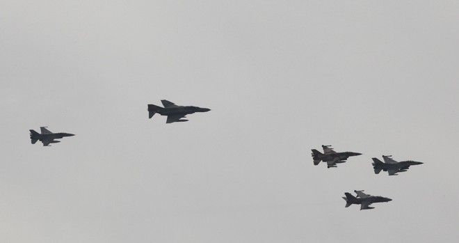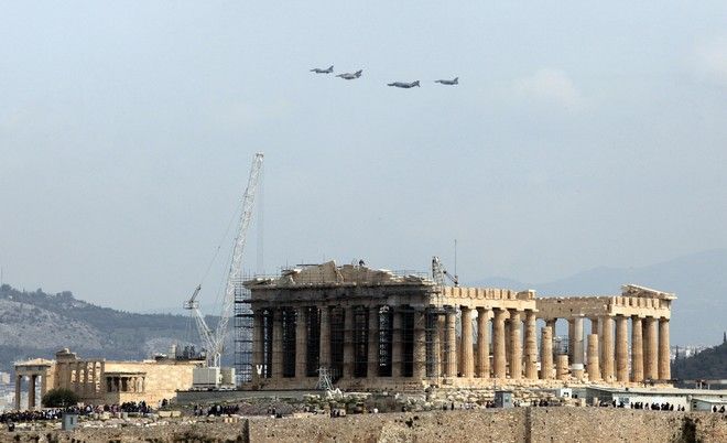Τον εκκωφαντικό ήχο των τουρμπίνων των μαχητικών αεροσκαφών άκουσαν το μεσημέρι της Τρίτης οι κάτοικοι της Αθήνας, καθώς σχηματισμός αποτελούμενος από δύο F-16, ένα F-4E και ένα AMX πραγματοποίησε δύο διελεύσεις σε χαμηλό ύψος πάνω από την Ακρόπολη.