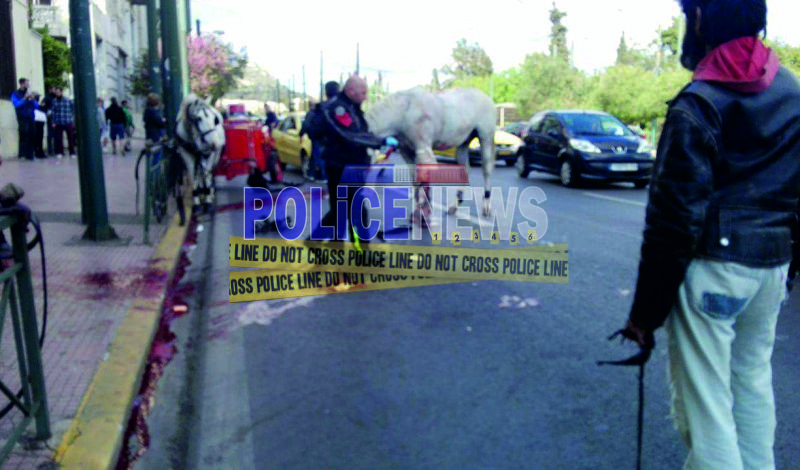 Άμαξα με δυο άλογα που εκινείτο στην οδό Αμαλίας, έξω από το Ζάππειο συγκρούστηκε σφοδρά με διερχόμενο ταξί, με αποτέλεσμα τον βαρύτατο τραυματισμό του ενός αλόγου.