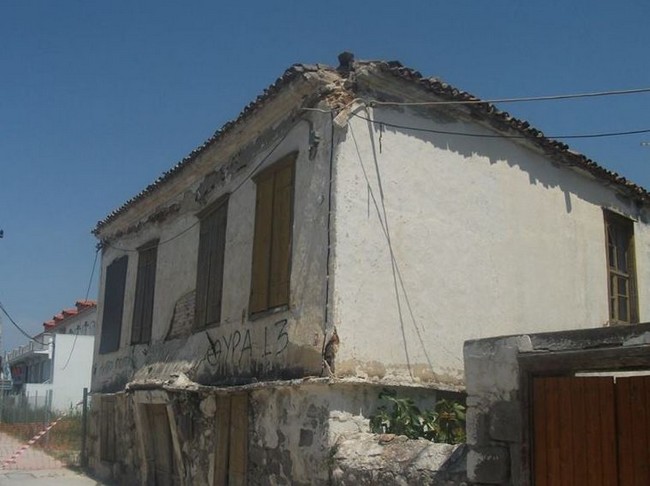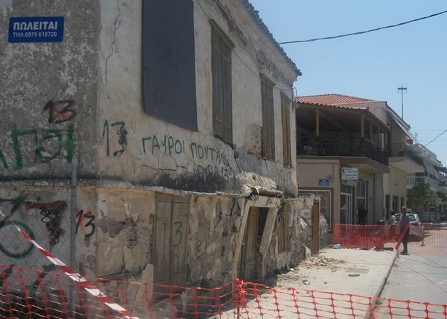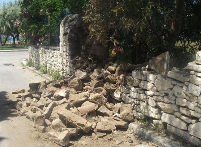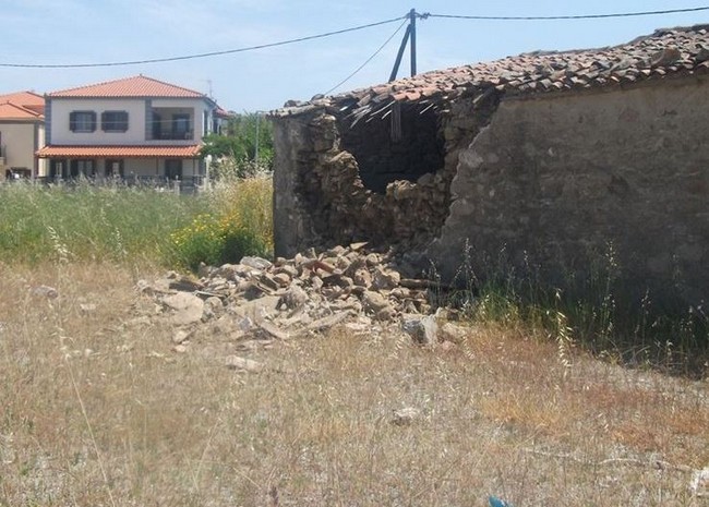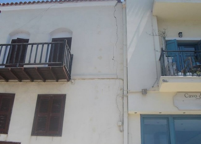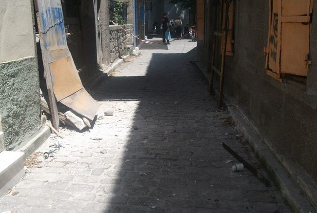 Τα συνεργεία του Δήμου κλείνουν σημεία δρόμων μέσα στη Μύρινα, όπου έχουν καταρρεύσει κομμάτια παλαιών κτιρίων.