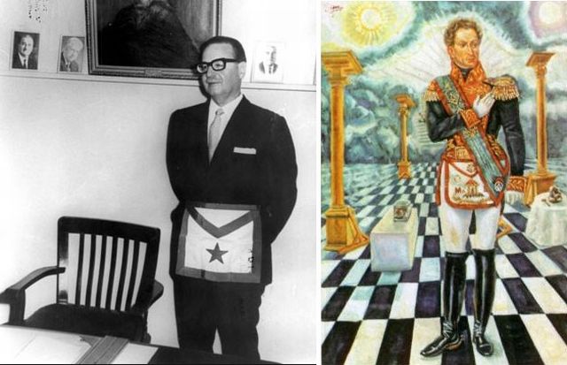 Αριστερά ο μεγάλος Αριστερός ηγέτης Σαλβαδόρ Αλιέντε, Πρόεδρος της Χιλής που δολοφονήθηκε από τους πραξικοπηματίες του Πινοσέτ και δεξιά ο Σιμόν Μπολίβαρ ο “Απελευθερωτής” που ακόμα και σήμερα εμπνέει τα σοσιαλπατριωτικά κινήματα της λατινικής Αμερικής. Αμφότεροι ήταν τέκτονες. Για τον Αλιέντε ειδικά, που θεωρείται μαρξιστής, ο ίδιος αυτοπροσδιοριζόταν ως θαυμαστής της Γαλλικής Επανάστασης και του πατριωτικού σοσιαλισμού όπως γεννήθηκε από τη Λέσχη των Ιακωβίνων.